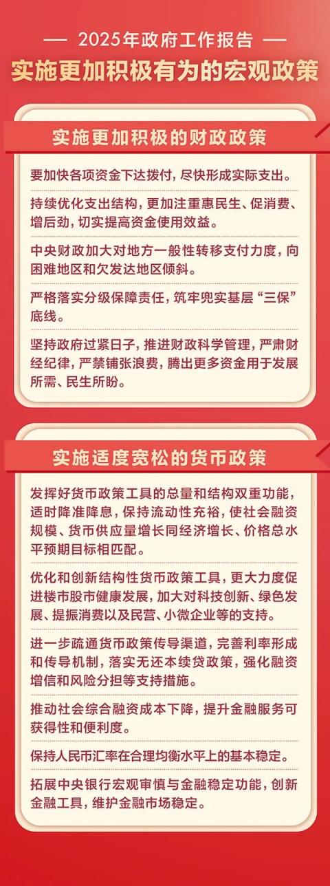 经济治理的主要对象是宏观经济运行。近几年来,针对我们国家的经济运行中的新情况新问题,党中央加大宏观调控力度,加力推出一揽子增量政策,打好政策“组合拳”,推动经济持续回升向好。2025年《政府工作报告》深入贯彻落实党中央决策部署,持续实施更加积极有为的宏观政策,最重要的包含实施更加积极的财政政策和实施适度宽松的货币政策。 孙彤/制图